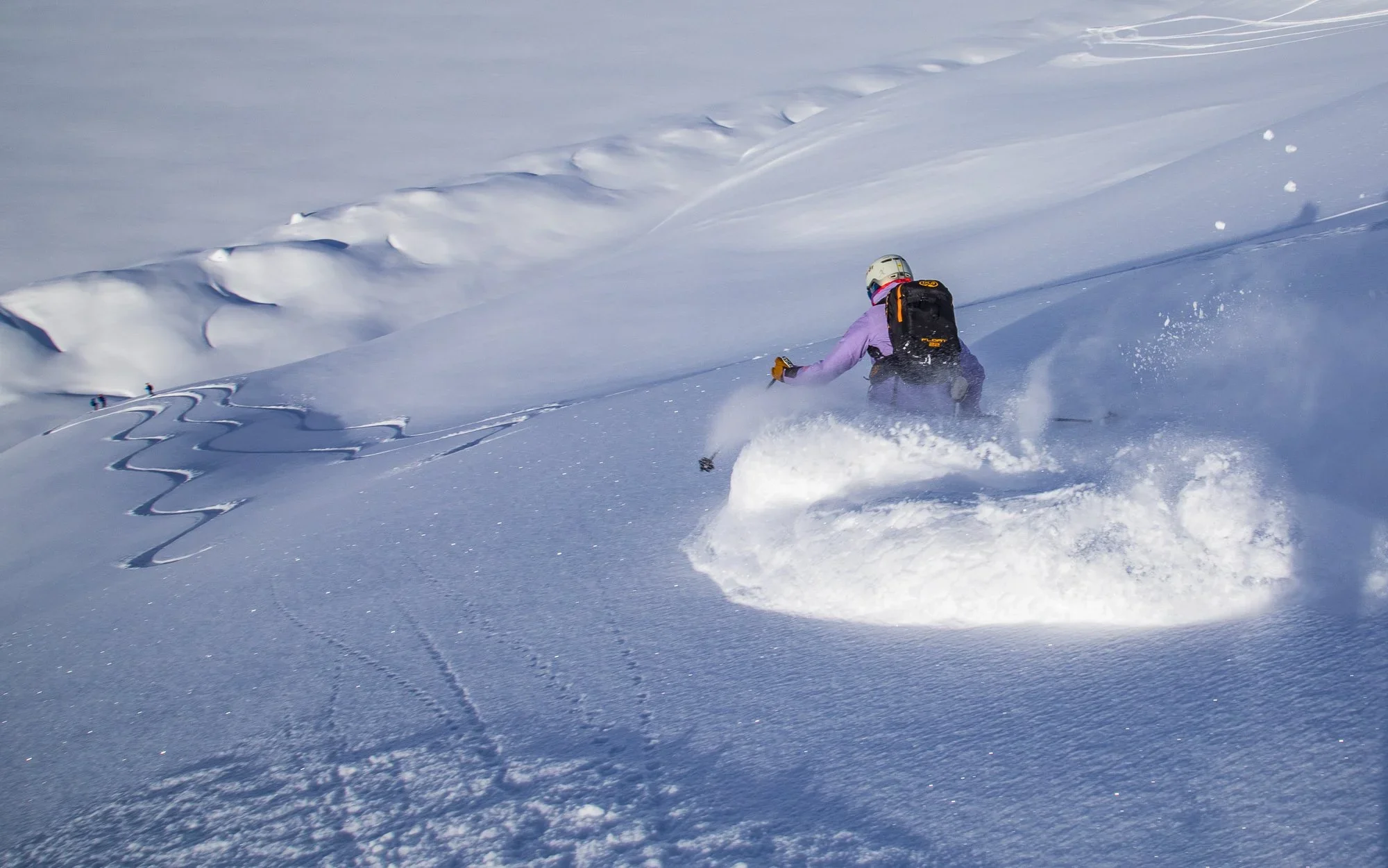 You are going to want to bring a good powder ski. A powder ski is wide underfoot (115 mm or more in the waist) and most often have some form of rocker or early rise plus a relatively soft flex. Some have unique sidecut shapes like reverse sidecut; the tip and tail are not always the widest parts of the ski. If you do not have a good powder ski, we also have skis for rent.